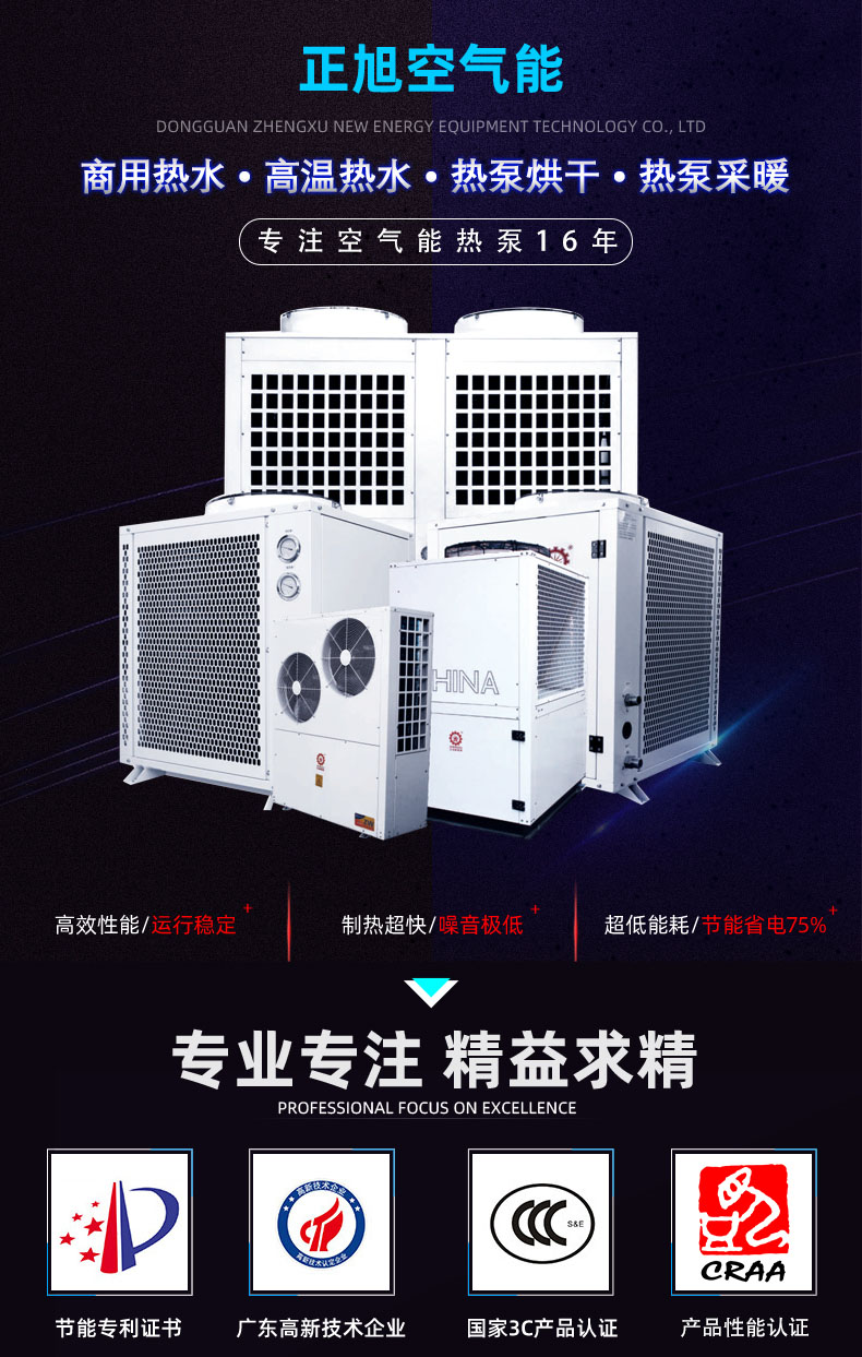 我司主要生產空氣能熱泵冷暖、熱泵烘干、高溫熱水、商用熱水設備四大系列,全國2000家經銷商,公司資質齊全,3000售后點,8000多個工程案例。選擇正旭=15年研發實力+合理價格+高端品質+優質售后+代理扶持+24小時400服務電話。 正...
