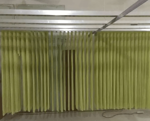 1. 剛進入烘干房等待烘干的掛面長度一般在1.4米左右,水分含量大,可以加強空氣流動促進面條去濕,使掛面初步定型,此階段烘干時間約為30分鐘,溫度在26攝氏度左右,濕度在55%-65%之間。