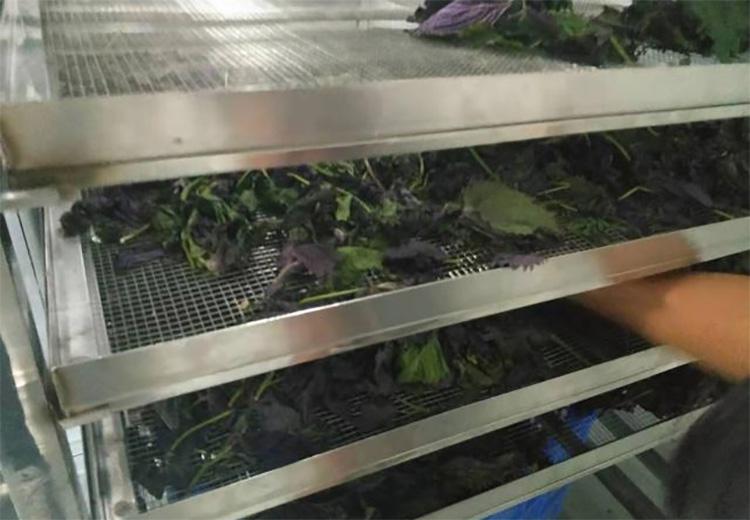 首先,紫蘇的單位體積大,重量輕,脫水率通常在80-85%,密集型堆放,會造成風流穿透不過的情況,此時外部的紫蘇已經(jīng)完全干燥,可是內(nèi)部的紫蘇卻還是鮮的,所以紫蘇在烘干時不能采用堆積的方式,且在烘干的過程中要注意適時進行翻動,讓熱風更加均勻的穿透紫蘇葉。